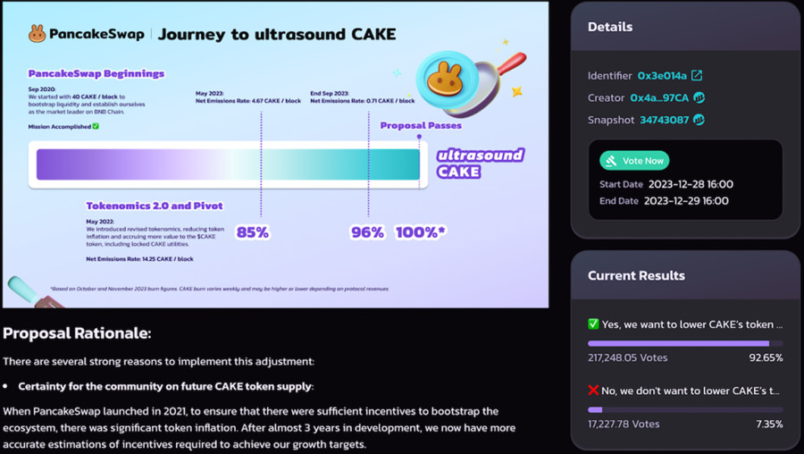 PancakeSwap提案代币CAKE供应上限减少3亿枚!赞成率高达九成