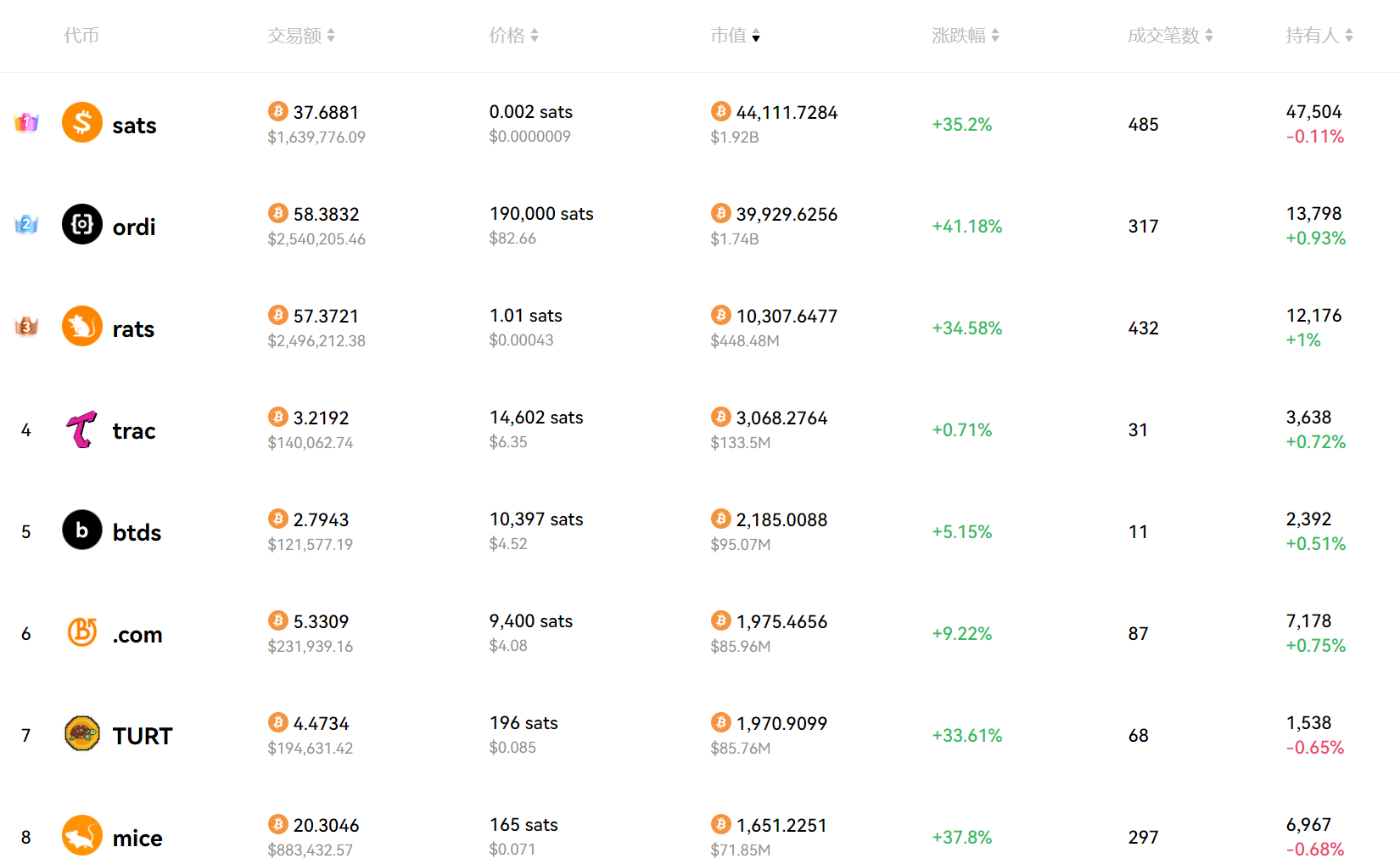 而昨日,涨势最凶猛的又回到BRC-20和比特币生态项目,根据okX Web3钱包数据,Sats、Ordi、Rats和mice,近24小时涨幅皆超过30%。