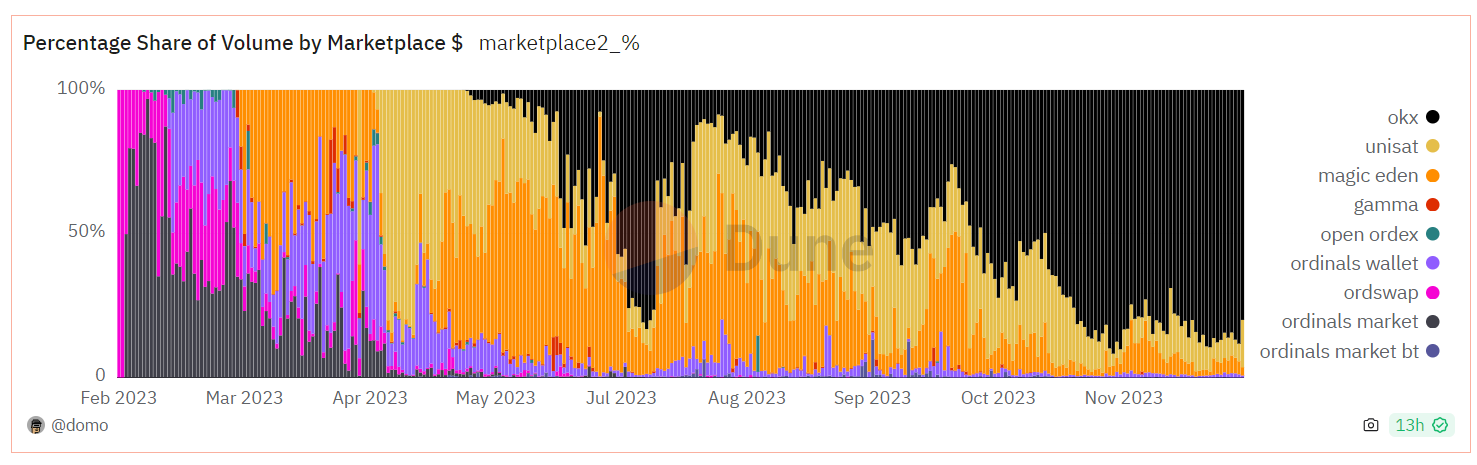 币安推出Web3钱包支持铭文的动机可能与OKX Web3钱包的成功经验有关。今年5月,OKX Web3钱包**引入了Ordinals市场,并凭借其流畅的使用体验、**的功能、多链支持、**的流动性和零手续费等特点,迅速获得市场好评,成为进入比特币生态系统的**平台。Dune的数据显示,比特币Ordinals的交易量占比超过80%,显示了OKX Wallet在铭文市场的广泛受欢迎程度。