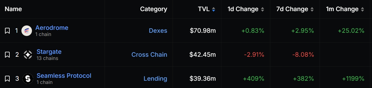 DefiLlama数据显示,目前Base链上DeFi协议的总锁仓价值(TVL)为3.37亿美元,Seamless Protocol的总锁仓价值为3936万美元,在Base链上名列第三,仅次于Aerodrome、Stargate。