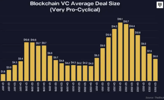 到目前为止,在这个周期中,比特币上涨了 2.8 倍,山寨币上涨了 1.7 倍。那么,在加密市场的周期中,VC 投资的情况如何?自 2022 年**季度以来,区块链的私募融资一直在放缓。根据 The Block 的数据,季度融资和交易数量都有所下降。2022 年初达到峰值后,平均交易规模显著下降。