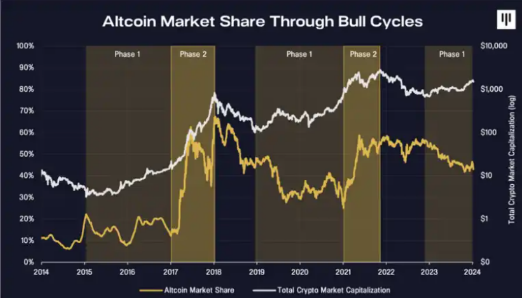 经常有投资者问我们,「各种**在牛市周期中的相关性如何?」为了对此提供一些视角,我们将分析最近的两个周期,在这两个周期中,比特币以外的可投资**领域占据了重要的市场份额。我们观察到,牛市周期有两个明显的阶段。**阶段是牛市的早期阶段,当时比特币往往表现优于市场的其他部分。第二阶段是后期阶段,那时山寨币往往表现更好。