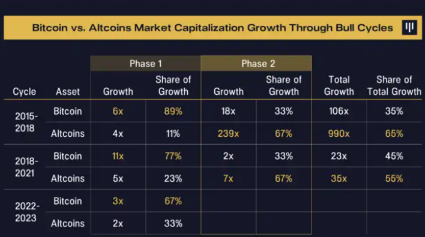 以下是比特币和山寨币在市值增长方面的实际回报,以及每种货币对加密货币市场整体增长的贡献程度。在这些周期中,比特币在上升周期的**阶段始终表现优于山寨币。在第二阶段,山寨币大幅超过比特币。有趣的是,山寨币在整个周期中的表现非常出色,以至于它们在两个完整周期中都超过了比特币。
