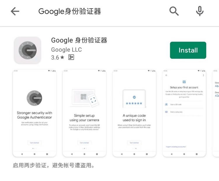 在Google Play Store上搜索Google 身份验证器,并点击Install按钮,安装完成后打开使用。
