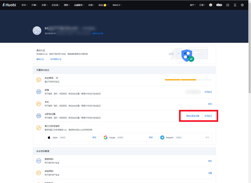 二、为火币账号绑定谷歌身份验证器