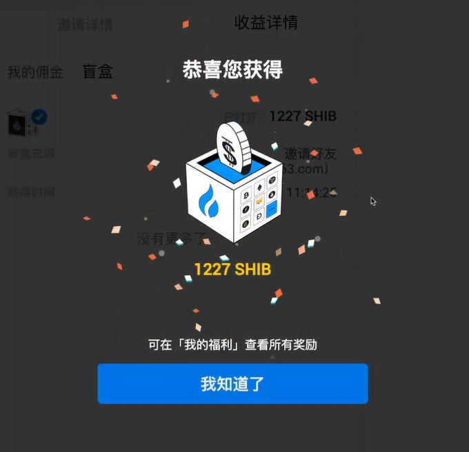 您可以在邀请返佣-我的邀请-收益详情-盲盒或我的福利中查看并打开您获得的盲盒,里面可能包含不同种类的数字货币,价值可高达10,000元。