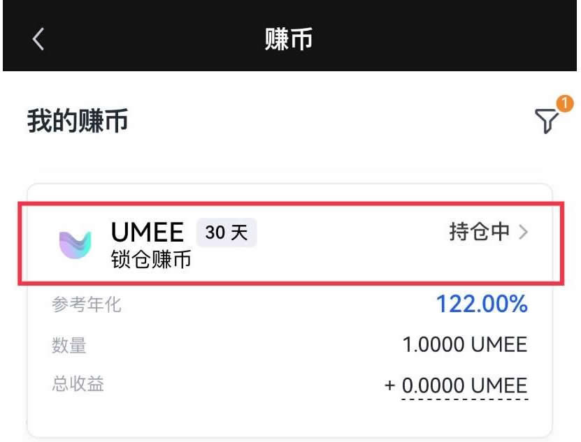 2、进入锁仓赚币页面,在搜索栏中搜索您想要申购的锁仓赚币产品(以UMEE为例),点击申购,即可申购相应期限的锁仓赚币产品。