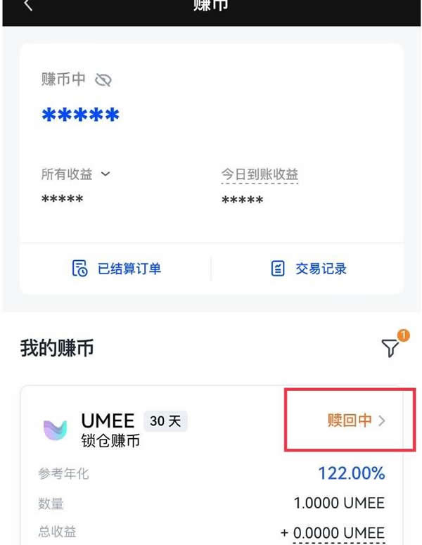 8、在我的赚币页面,显示相应的锁仓赚币产品在赎回中,点击赎回中可以查看详情。