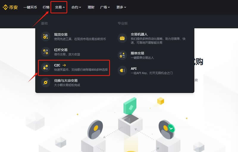 6、点击上方导航栏的【交易】——【C2C】