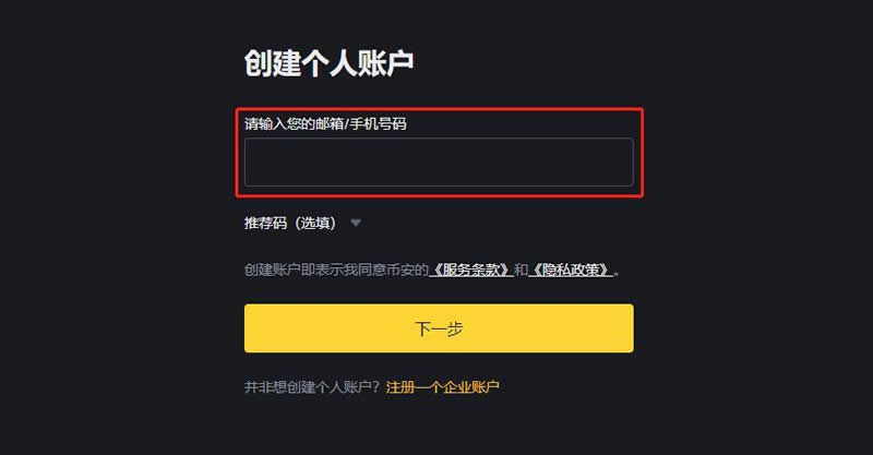 2、币安已**开放大陆用户进行手机号注册,输入邮箱/手机号、点击下一步即可