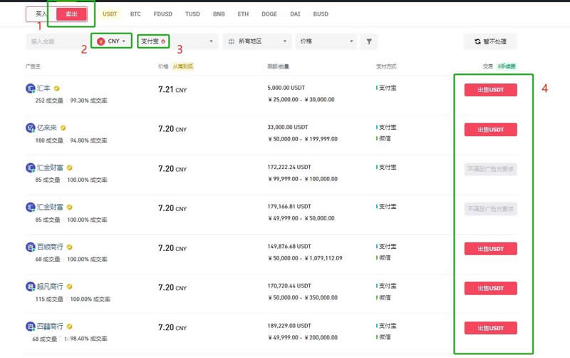 7、选择的出售,选择法定货币CNY,选择支付方式,找到合适的商家进行出售
