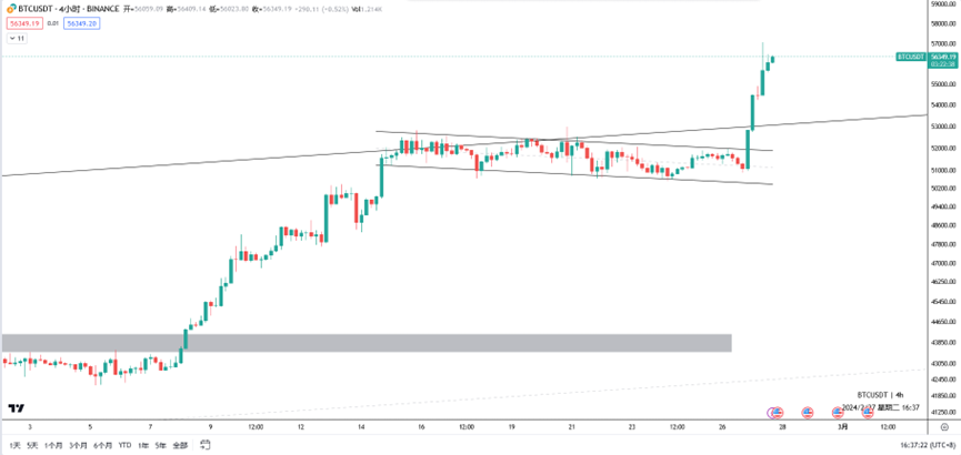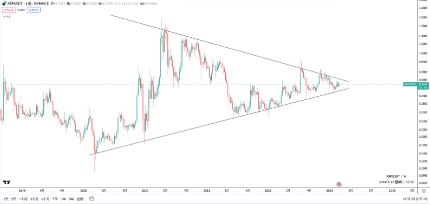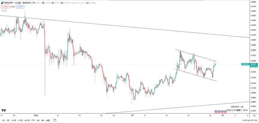 XRP:周线级别快要走出方向了,大概率是向上。4小时级别走出旗型上涨中继,大概率是要突破向上的。有仓位的拿好就行,没有仓位的可以考虑在旗型下边界入场。