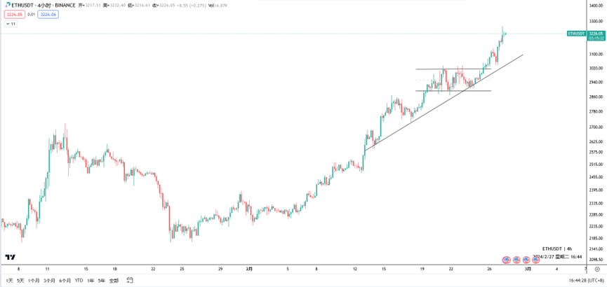 ETH:已跟随大饼,继续走强。后续的利好有坎昆升级和ETF的通过。ETH有望带领山寨冲高一波。 支撑位:3060,压力位: 3500。