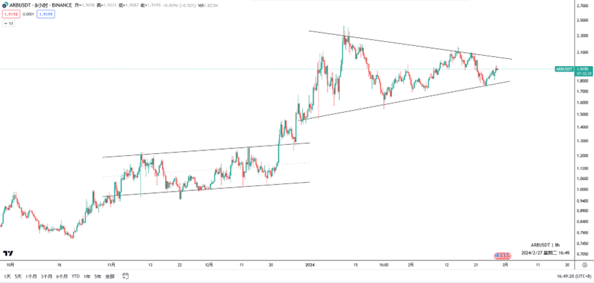 ARB:在高位强势收敛,如果有仓位就继续持有,在回调到下边界的时候可以加仓。