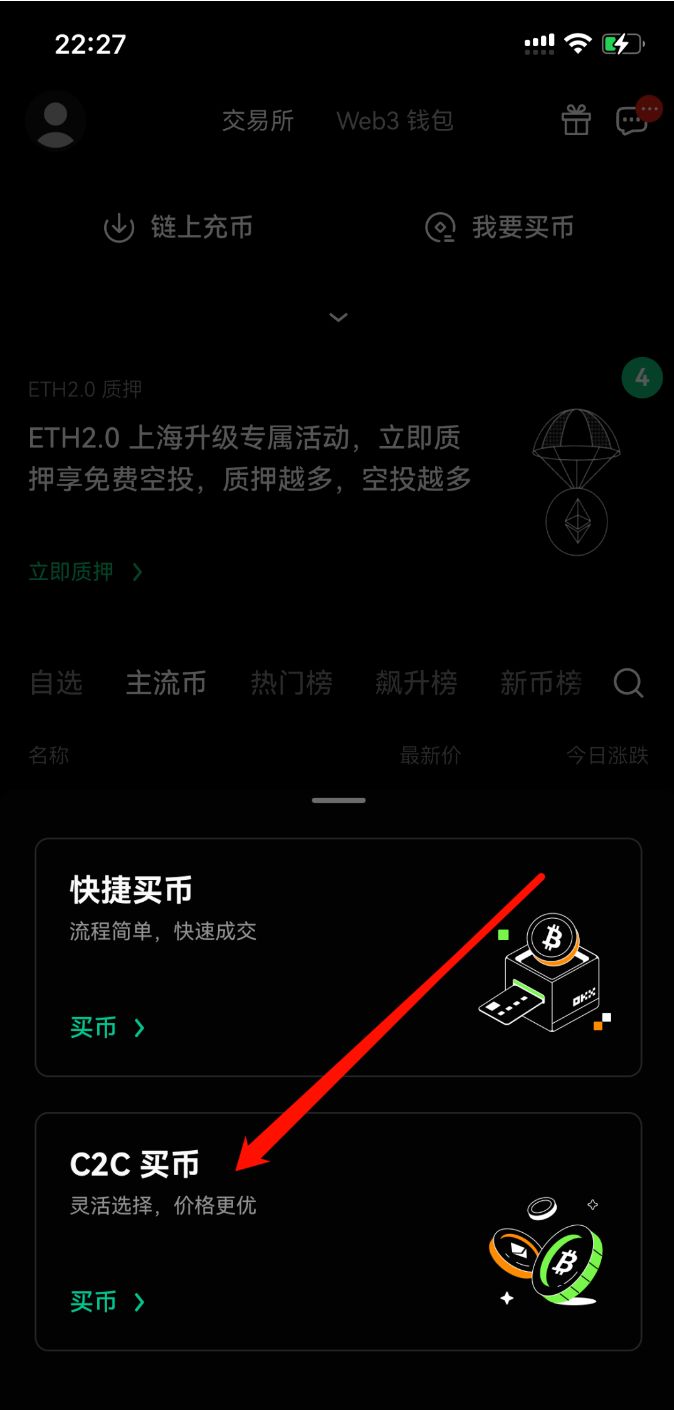 2.选择C2C交易,即RMB购买usdt,只有换算成USDT才能进行买卖