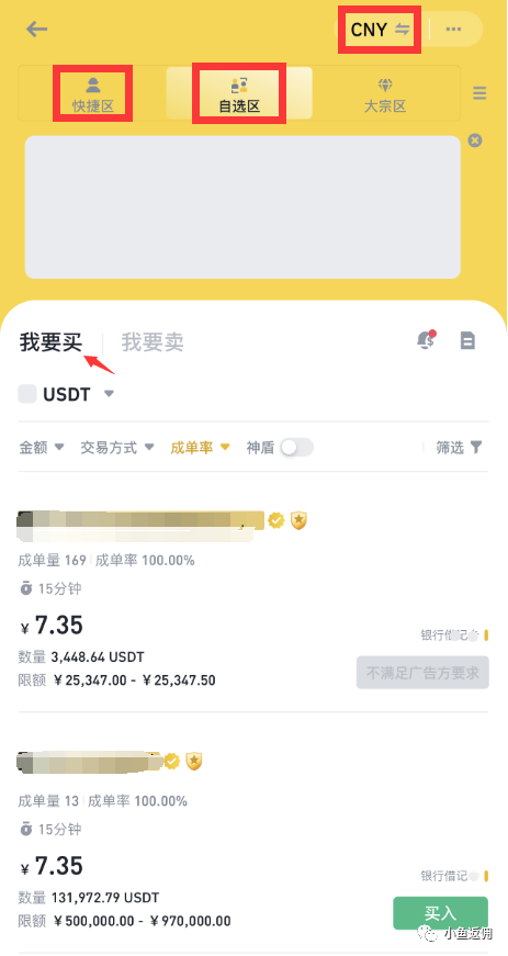 尽量选择成单率高的商家,注意右上角的CNY标识,如果小额想快速购买,那就选择快捷区,但是卖的话**不要在快捷区进行