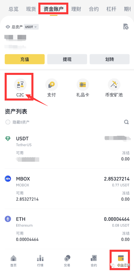 右下角资金-最上面资金账户里有一个C2C,由此进入,买和卖都是在里面进行哦~