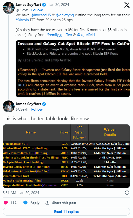 虽然一些发行商目前正在对其现货比特币ETF免除费用,但这些费用**都会到期,此后,持有人将根据他们投资的产品支付每年0.19%至1.5%的管理费。