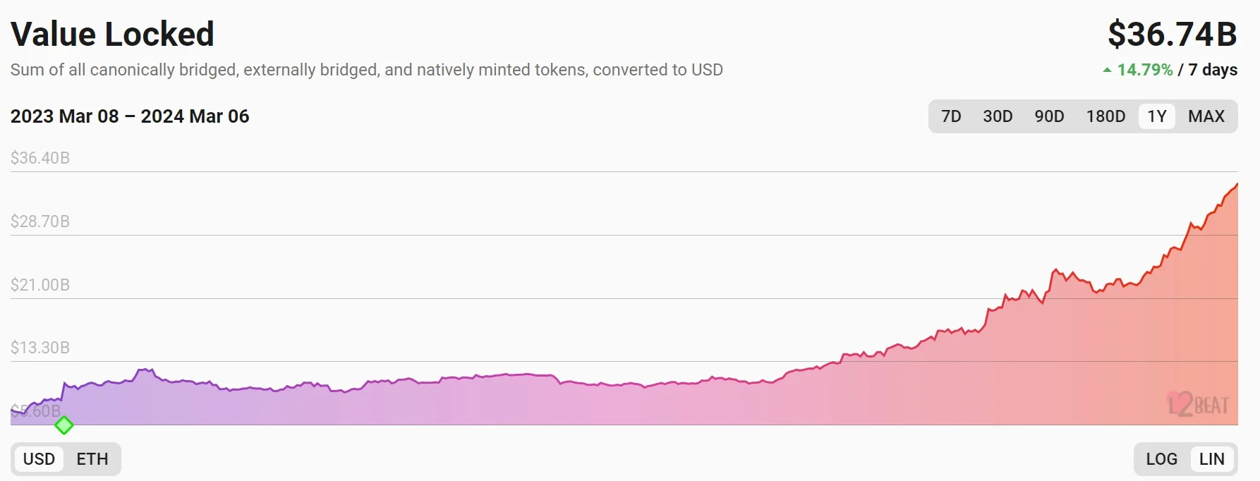 在坎昆升级邻近之际,据L2BEAT数据显示,当前以太坊Layer2总锁仓量(TVL)已攀升至367.4亿美元,持续刷新新高,7日增幅达14.8%。