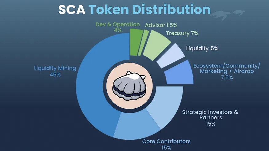 官方说明,$SCA的总量为2.5亿枚,空投与生态、社群、行销整个占据总供应量的7.5%(1,875万),其余**的分配为: