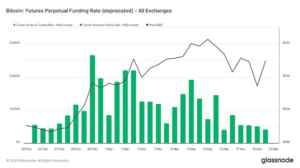期货资金费率:本周费率恢复正常水平。费率0.05-0.1%,多头杠杆较多,是市场短期顶部;费率-0.1-0%,空头杠杆较多,是市场短期底部。