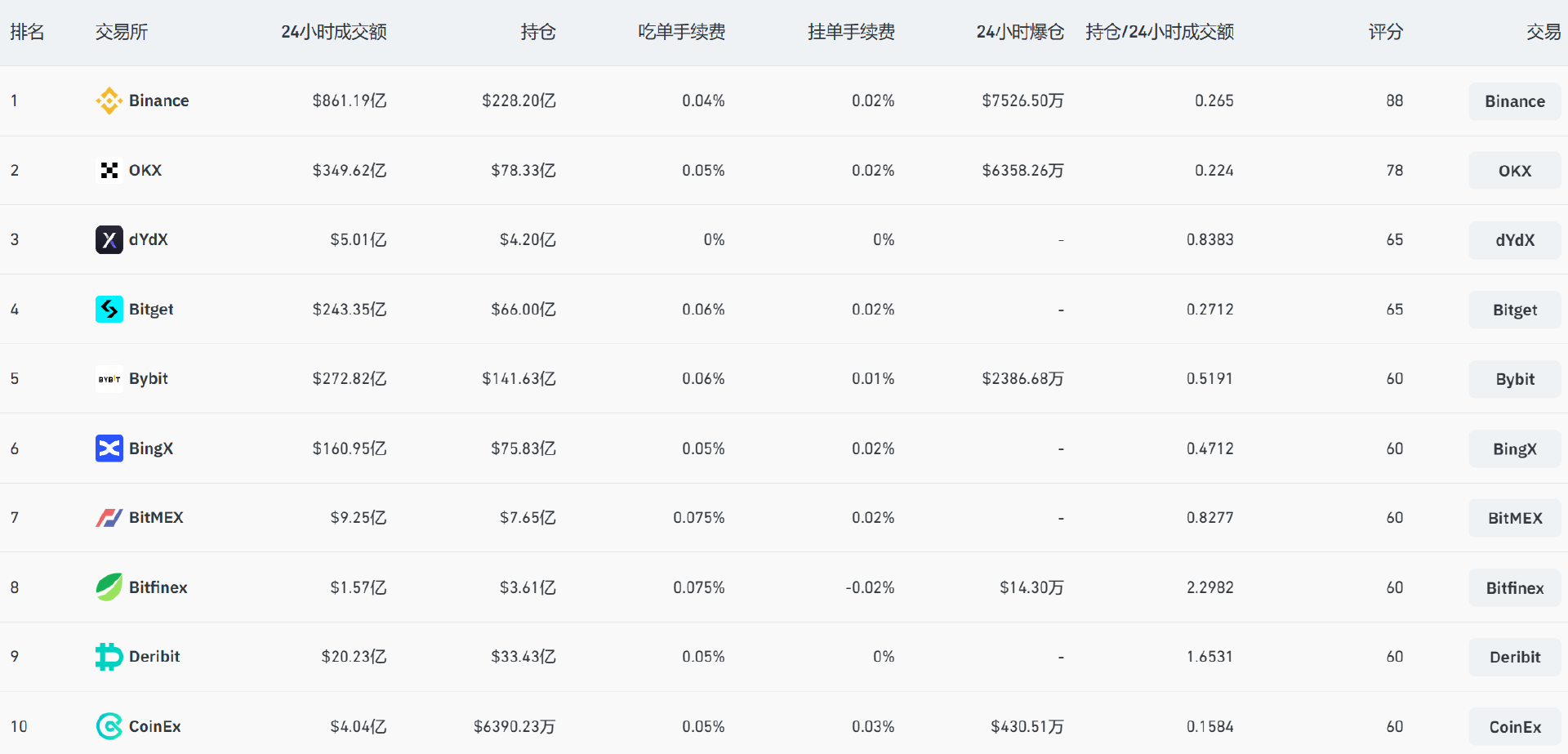早在 2020 年,CEX 以合约期货为代表的衍生品交易就开始取代现货交易,逐步成为主导市场。Coinglass 数据显示,过去 24 小时,前五大 CEX 合约期货日交易量均已经达到百亿美元级别,头部的币安更是突破 800 亿美元。