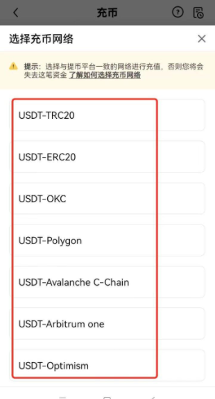 请注意:充币网络的选择**重要,虽然您可选择任意一个网络进行充币,但网络之间并不互通。当您充币时,**要确认汇出选择的网络,与在欧易选择的网络保持一致。例如:您在欧易选择USDT-TRC20充币,那么在汇出方平台或钱包操作转出时也要选择TRC20,若选择其他网络,将无法成功到账。