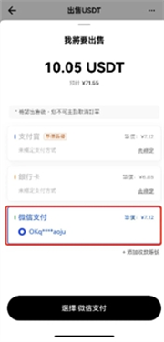 5.选择支付宝、银行卡或微信作为收款方式,完成卖币流程。