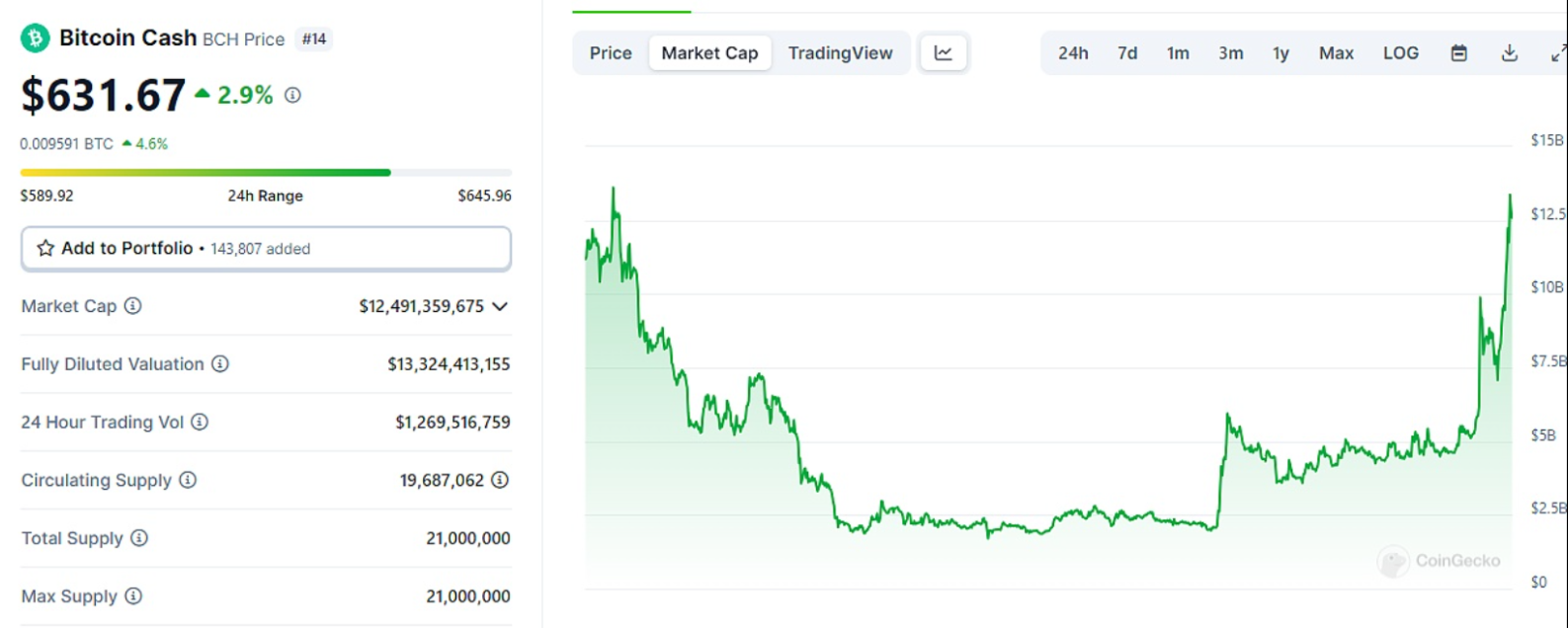 4月3日财经报道,据Coingecko数据显示,BCH市值已升至125亿美元区间,当前触及12,491,359,675美元,创2021年11月以来新高,当前BCH报631.67美元,过去7日涨幅30.1%。另据BTC.com数据显示,当前距离BCH减半还有不到10小时。