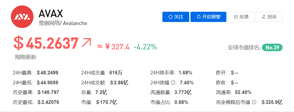 雪崩网络今日价格为$45.25,其24小时的交易量为$28603.3万。雪崩网络在过去24小时内下跌了4.22%。目前市值排名为第39位,其市值为170.743亿USD,流通总量为37731.1万AVAX,发行量为72000万AVAX。
