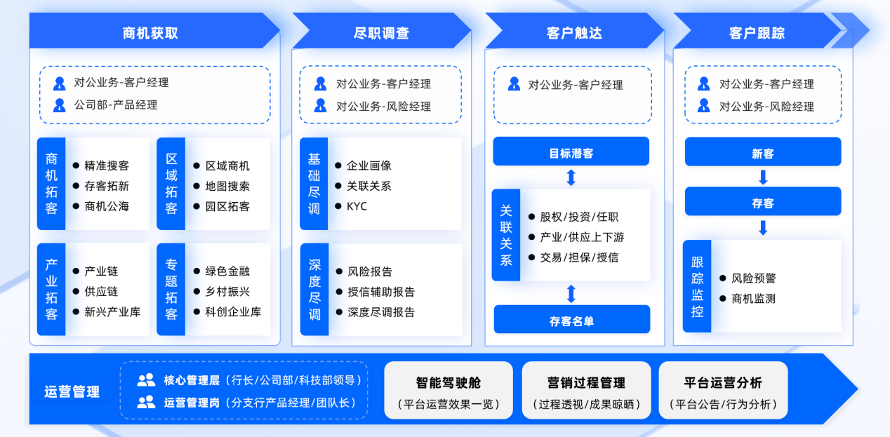 针对这些问题,合合信息旗下启信宝推出了银行对公数字化方案,帮助银行突破数据应用、风险管理、客户拓展等多场景堵点,创新性将商机获取、尽职调查、客户触达、运营管理等流程融为一体;打造“启信宝商机事件库”,针对各地产业政策、**产业、产业园区等现状与资源禀赋,差异化打造数字化营销平台。