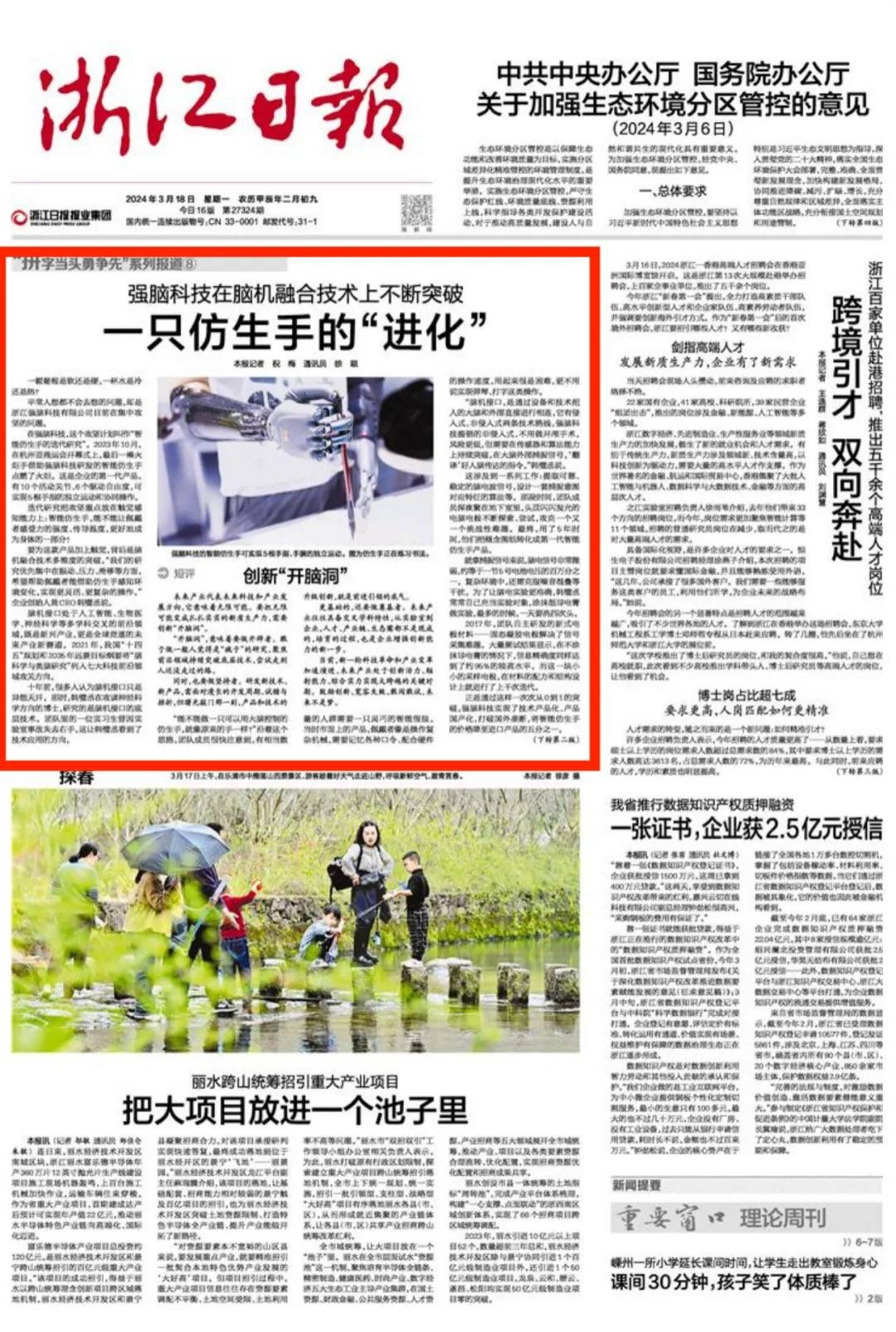 脑机接**术处于多学科交叉的前沿领域,是新兴产业也是全球竞争的未来产业新赛道,被纳入我国“十四五”规划和2035年远景目标纲要的七大科技前沿领域攻关方向。通过技术突破和产品迭代,强脑科技成功实现了智能仿生手的技术产品化和国产化,**了价格,打破了国外垄断,使其价格仅为进口产品的五分之一。 2023年10月的杭州亚残运会开幕式上,**一棒火炬手使用强脑科技研发的智能仿生手成功点燃了火炬,企业创始人兼CEO韩璧丞表示,在智能仿生手的研发方面,他们致力于在振动、压力、滑移等方面进行突破,帮助佩戴者感知环境变化,实现更加灵活、复杂的操作。 余杭引来“独角兽” 与马斯克一较高下 《解放日报》3月20日 10版