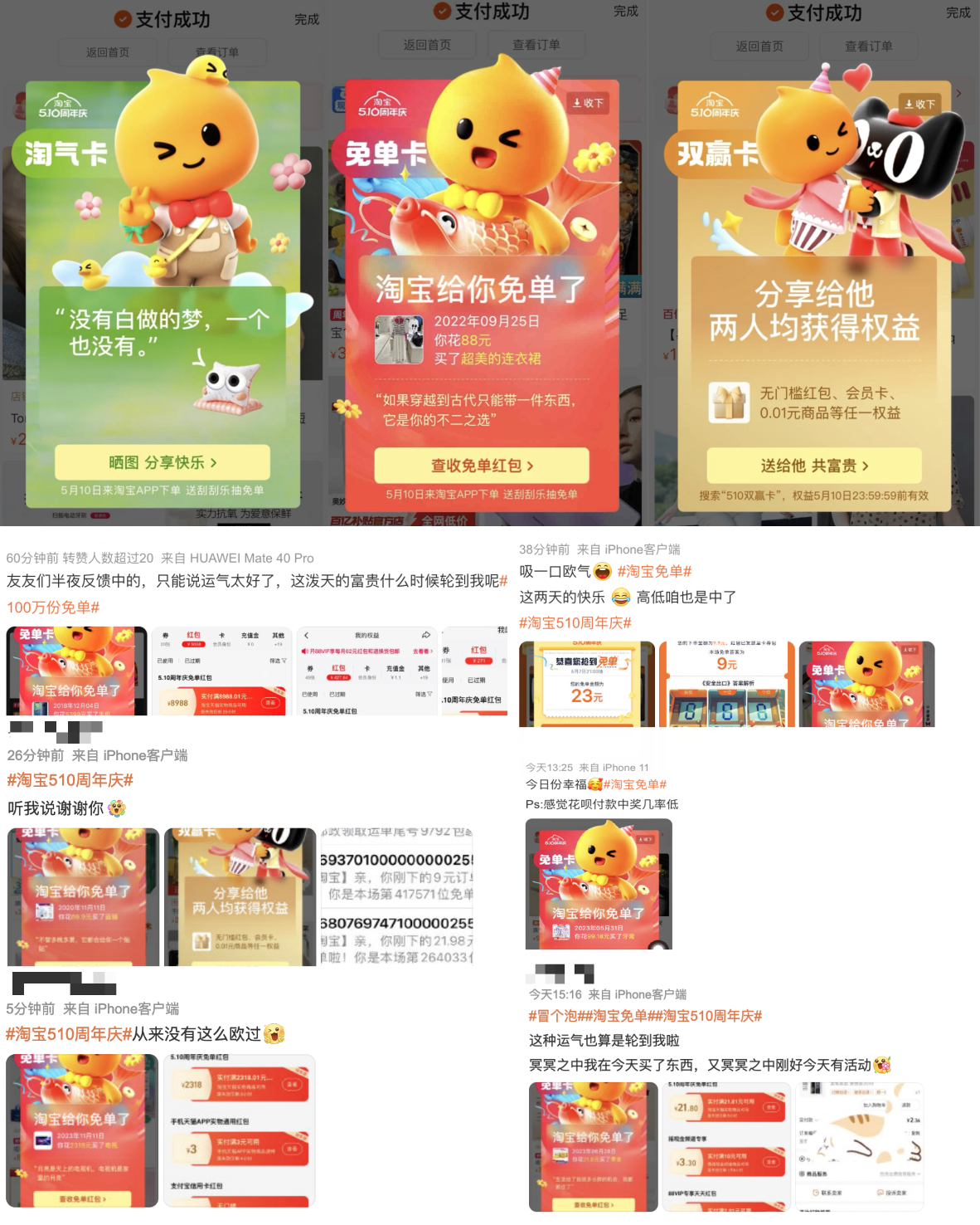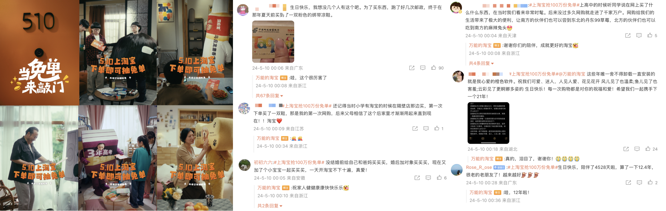 今年淘宝510周年庆在5月6日拉开序幕,淘宝冷启动上线了名为「淘宝免单」的猜题免单活动,悄悄将51元免单短信发送到了“押中题目答案”的用户手机里。不少用户以为是淘宝系统bug,在小红书、微博等社交媒体上引发了广泛讨论,吸引了大量用户的关注。