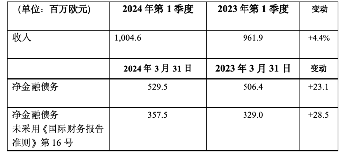 截至2024年3月31日,净金融债务为5.295亿欧元,比2023年3月31日时的净额增加2310万欧元。排除《**财务报告准则》**6号的影响,净金融债务为3.575亿欧元,比2023年3月31日增加2850万欧元。