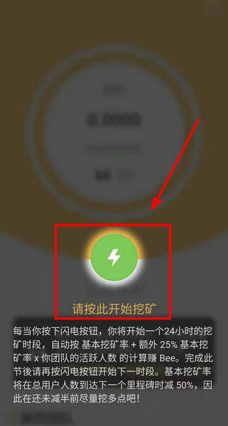 注册完成,点击绿色闪电开始挖矿,以后等24小时倒计时结束,再点击闪电启动即可,如图所示: