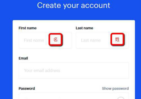 2.First name输入名,Last name输入姓。输入信箱、密码,密码至少八位。