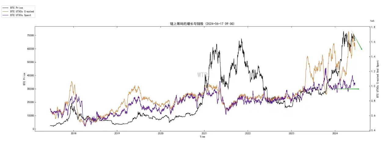 链上筹码显示,新增力量开始下降,当然销毁卖出也开始下降,市场在这段时间可能会进入空白期。