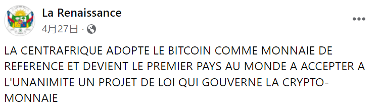 4 月 27 日,中非共和国官方 Facebook 账号发布消息称,中非共和国正式采用比特币作为支付货币。