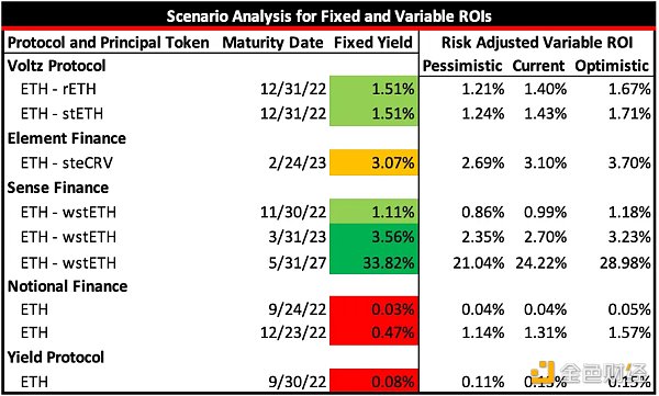 虽然上述所有协议都允许用户采取固定利率的头寸,但只有少数几个协议(Voltz Protocol, Element Finance, Sense Finance, Notional Finance, and Yield Protocol)提供的产品,我认为可以与 ETH 质押奖励率进行公平的比较。