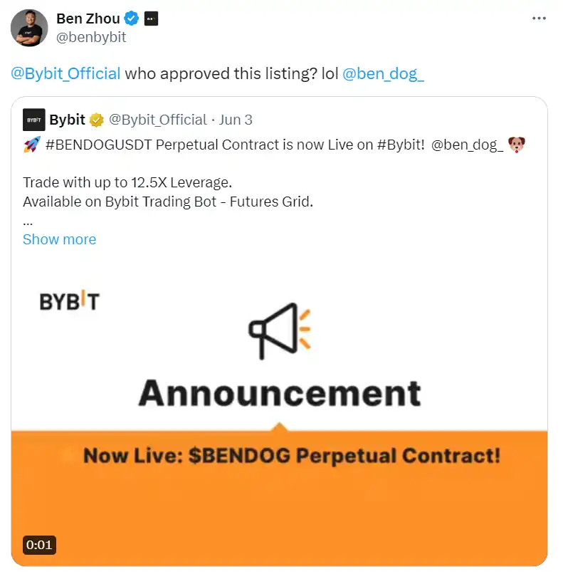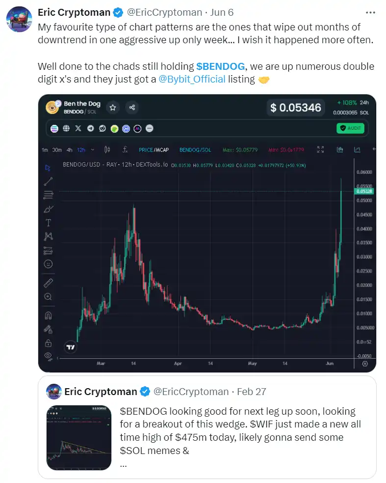 $BENDOG 正是如此。在**波的 Solana Meme Token 热潮中,它在半个月的时间内冲到了 5000 万美元的市值高点,随后因为市场整体热度的消退而陷入调整。但当第二波 Solana Meme Token 热潮来临时,它没有被遗忘,又在半个月时间内从 500 万美元的市值跃升至 8000 万美元。这样的强势复苏引起了数百位加密 KOL 的关注,甚至 Bybit CEO @benbybit 都在其个人 Twitter 上发推讨论 $BENDOG。