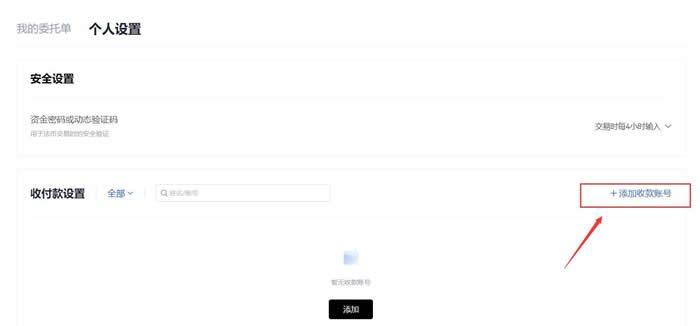 左上角点击【买币】—右上角【更多】—【个人设置】—【添加收款账户】,按要求完成操作。