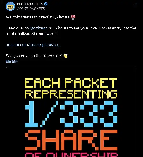 ● 1 小时后,像素钱包 @PIXELPACKETS 开启 mint。前往 @ordzaar 获取 Pixel Packet 进入 fractionalized Shroom world!