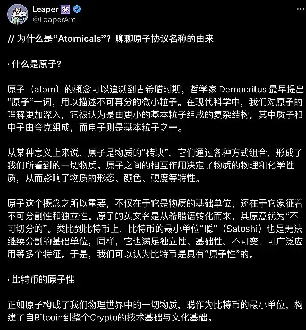 ● 「Atomicals」这个名称源自「原子」的概念,象征着比特币的**单位「聪」具备的不可分割性和独立性。Atomicals 继承了这一理念,通过 ARC-20 标准和原子数字对象,将比特币扩展为数字世界中的「原子」,推动比特币进入更灵活多样的应用时代,**成为未来数字文化的重要基石。by @LeaperArc