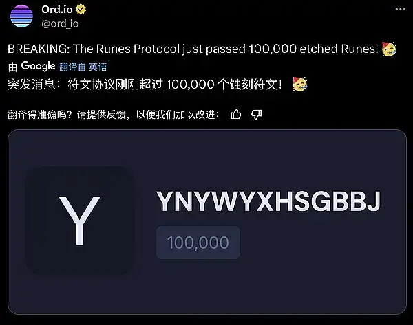 ● Runes 协议刚刚超过 100,000 个铸造符文!