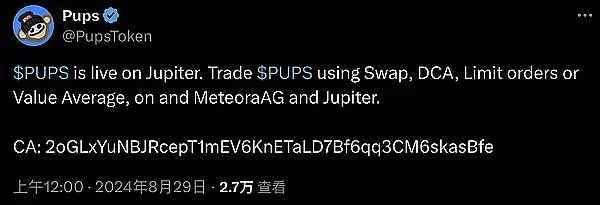 ● $PUPS 在 Jupiter @JupiterExchange 上线。使用掉期、DCA、限价订单或价值平均值在 MeteoraAG 和 Jupiter 上交易 $PUPS。CA:2oGLxYuNBJRcepT1mEV6KnETaLD7Bf6qq3CM6skasBfe