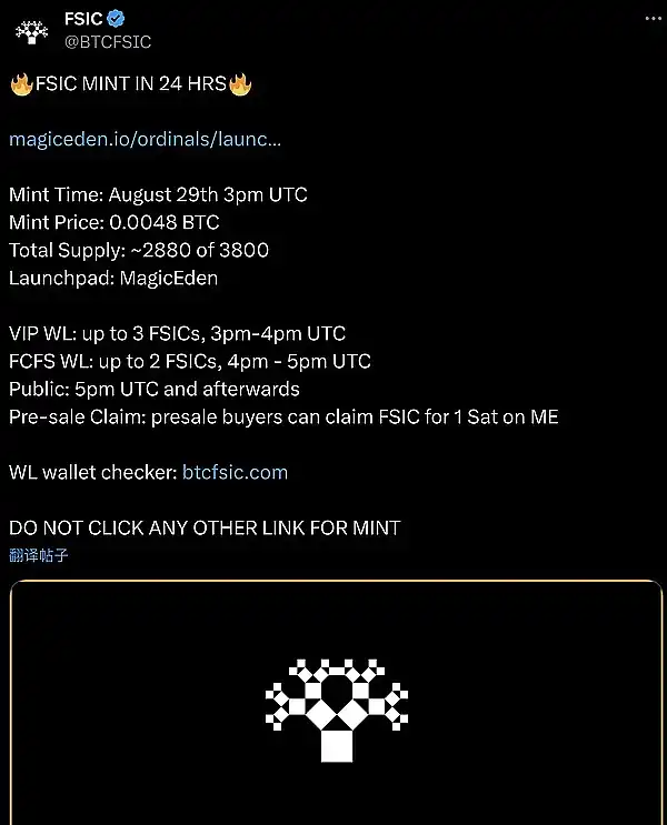 ● 2 小时后,Fisc @BTCFSIC 开启 mint。流程,VIP WL 最多 3 个 FSIC,1 小时。FCFS WL 最多 2 个 FSIC,1 小时。公开 UTC 时间下午 5 点及之后。预售申领,预售买家可以在 ME 上申领 1 个 Sat 的 FSIC。
