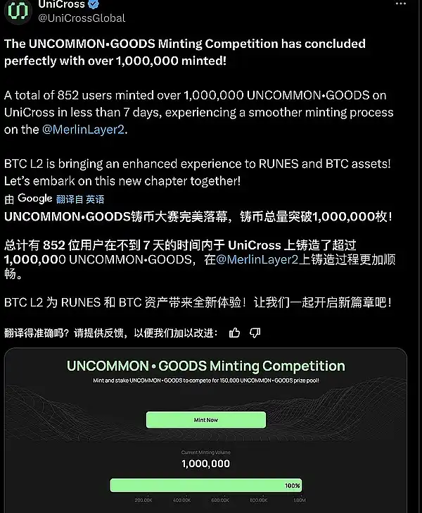 ● UNCOMMON•GOODS 铸币大赛**落幕,铸币总量突破 1,000,000 枚!占当前供应量的 5%。在 @UniCrossGlobal @MerlinLayer2 上铸造过程更加顺畅。