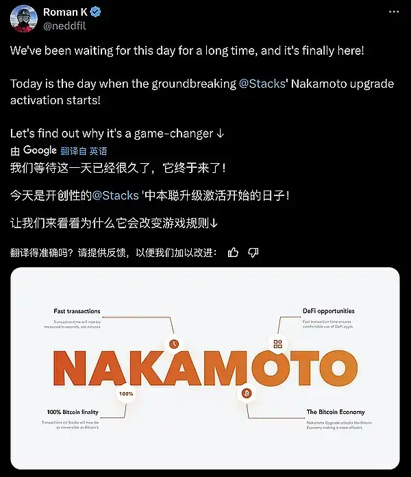 ● Stacks @Stacks 的 Nakamoto 升级现已激活。带来了显著提升:交易速度更快,几乎即时确认;实现了真正的比特币终局性,确保交易安全且不可逆;提升了 DeFi 性能,将互动时间缩短至秒级;通过签名者验证增强网络安全性。