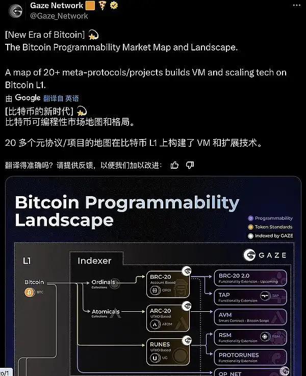 ● 比特币的新时代,比特币可编程性市场地图和格局。20 多个元协议/项目的地图在比特币 L1 上构建了 VM 和扩展技术。by @Gaze_Network