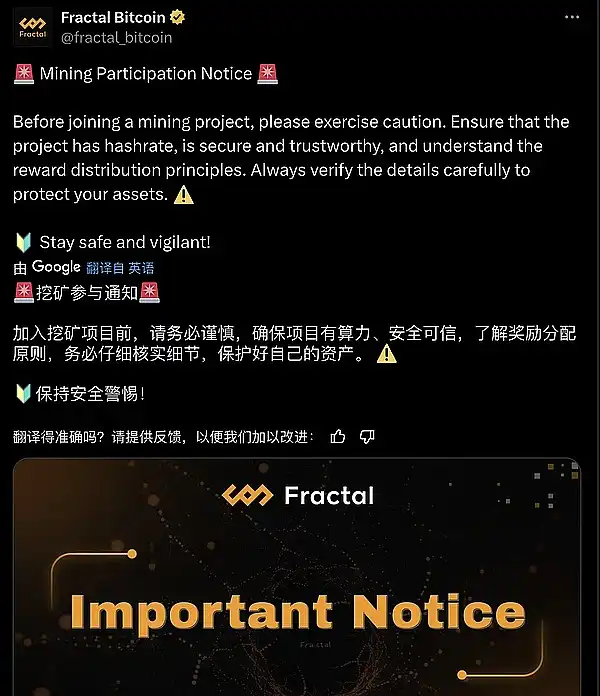 ● Fractal @fractal_bitcoin 官方对于挖矿 $FB 给出提示。加入挖矿项目前,请务必谨慎,确保项目有算力、安全可信,了解奖励分配原则,务必仔细核实细节,保护好自己的资产。